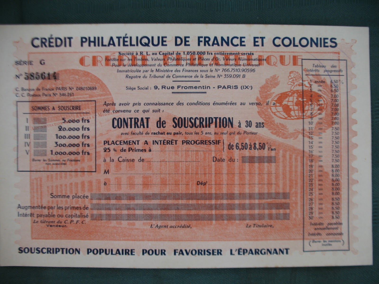 Tu avais monté ton entreprise, à la fin des années 40 ou au début des années 50, le Crédit Philatélique de France et Colonies, C. Banque de France PARIS N° 048010889, C. C. Postaux Paris N° 546.261, immatriculée par le Ministère des Finances sous le n° 766.7510.90596, au Registre du Tribunal de Commerce de la Seine N° 359.091 B, Siège social : 9, Rue Fromentin, Paris, dans le neuvième arrondissement, tout près du Métro Pigalle, où je suis descendu plusieurs fois sans toutefois aller voir sur place où se trouvait ton magasin, maintenant un peu connu à travers ce blog...